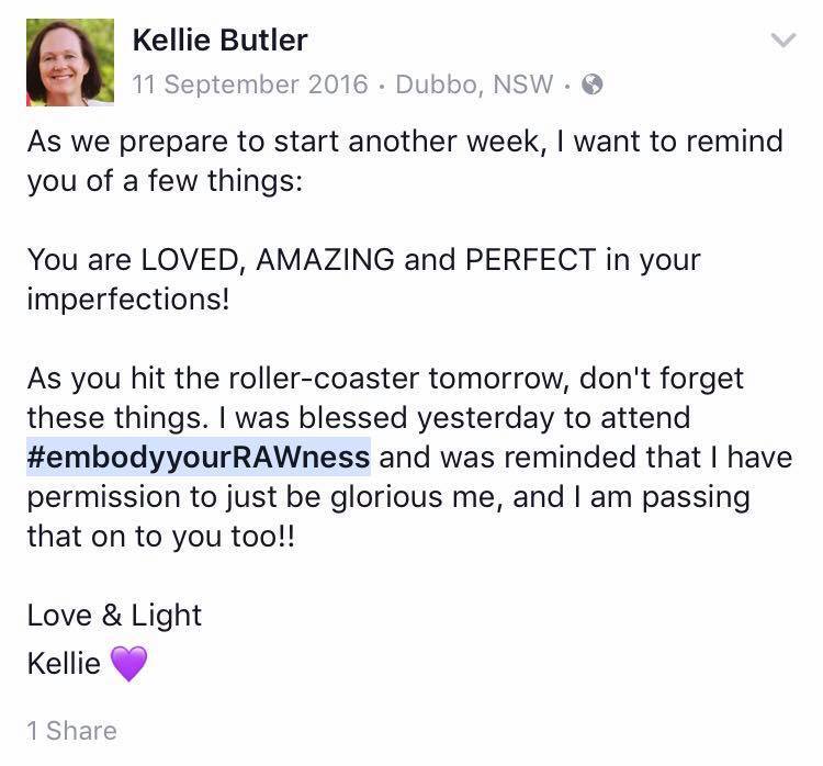 Today I continued another huge step in my journey of self discovery. Today I attended Embody your Rawness event. #embodyyourrawness hosted by Amanda Jane Mckay. What a wonderful, inspiring, motivational day it was. Amanda brought some amazing spiritual goddess to Dubbo. These 5 goddess bought with them their own story's of their journeys. I felt like a sponge soaking in all of the information and messages they were sharing. Today I learnt I am not alone, there are so many woman feeling like me, so many woman walking a journey and growing and overcoming fear. I have walked away feeling proud of my success so far, proud of how far I have come and proud of who I am. I know I have gifts to give, I am a teacher, a leader and I have a story to tell. Amanda your guidance and support continues to help me grow. Thank you for today and thank you for inspiring me each and everyday!